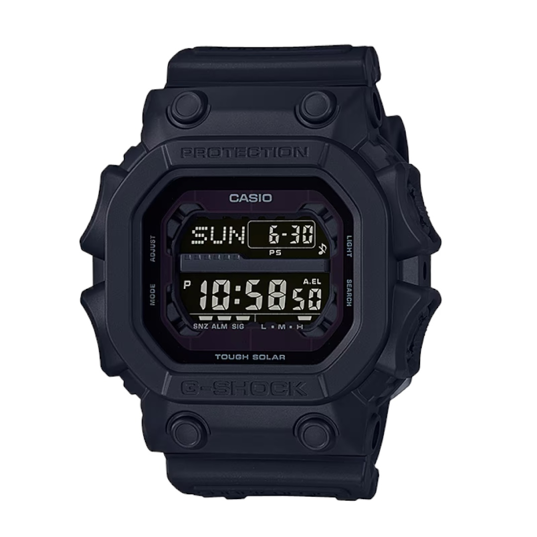 O Casio G-SHOCK GX-56BB-1 é a expressão máxima da resistência. Conhecido como “The King of G-SHOCK”, seu design robusto e imponente foi desenvolvido para suportar impactos extremos e condições severas. Com estrutura reforçada e proteção total em resina, ele oferece durabilidade incomparável. O mostrador digital conta com iluminação automática Super Illuminator, cronômetro, temporizador, cinco alarmes diários e hora mundial. Resistente à água até 200 metros e equipado com energia solar, o GX-56BB-1 combina potência, tecnologia e estilo em um visual inteiramente preto e marcante.